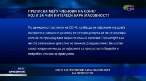 „ПО ДЕНЕШНИОТ СОСТАНОК НА СОНК ТРЕБА ДА СЕ ИЗЈАСНИТЕ КОЈ ДОАЃА НА ПРОТЕСТ, КАЖАНО Е ДОКОЛКУ НЕ СЕ ПРИСУСТВУВА ДА НЕ СЕ РЕАГИРА КОГА ЌЕ СЕ ПРИМЕНУВААТ МЕРКИТЕ КОИ НЕ ЗАСЕГААТ! ВЕ МОЛАМ СЕКОЈ ПОЕДИНЕЧНО ДА СЕ ИЗЈАСНИТЕ ЗА ПРИСУСТВО, БИДЕЈЌИ Е ПОТРЕБЕН СПИСОК ЗА ПРИСУСТВО!“