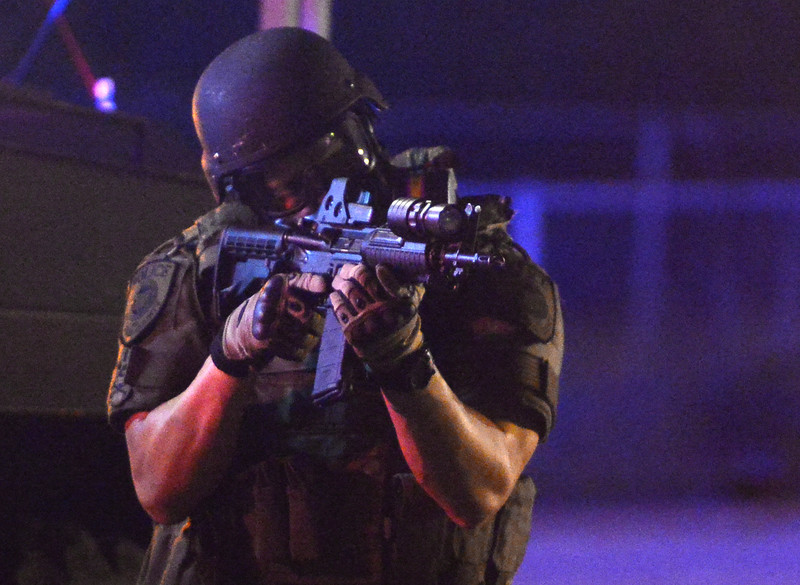 epa04359621 A police officer aims his rifle as demonstrators protest the shooting death of Michael Brown in Ferguson, Missouri, USA, 18 August 2014. The governor of the central US state of Missouri Jay Nixon lifted a curfew in a St Louis suburb that has seen a week of racial unrest, after he ordered National Guard soldiers to deploy to help restore order. Nixon ordered the deployment of the National Guard early 18 August after violence flared during the second night of a curfew in Ferguson. The unrest followed the 09 August fatal shooting of an unarmed black teenager, Michael Brown, by a police officer. EPA/LARRY W. SMITH