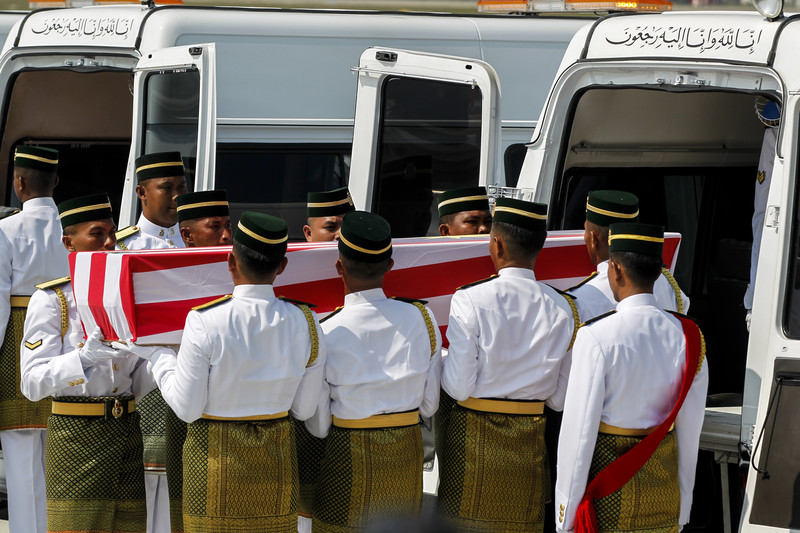 epa04363244 Royal Malay Regiment army personnel carry a coffin to a hearse during the arrival ceremony of Malaysia Airlines MH17 victims, at the Kuala Lumpur International airport in Sepang, Malaysia, 22 August 2014. A special Malaysia Airlines flight from Amsterdam carrying the remains of 20 Malaysians aboard downed flight MH17 arrived in Kuala Lumpur as the country observed a day of mourning. The plane was met by relatives and senior officials at Kuala Lumpur International Airport where a ceremony was held to honor the victims. EPA/AZHAR RAHIM