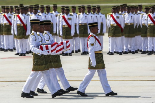epa04363273 Royal Malay Regiment army personnel carry urns with ashes of cremated remains during the arrival ceremony of Malaysia Airlines MH17 victims, at the Kuala Lumpur International airport in Sepang, Malaysia, 22 August 2014. A special Malaysia Airlines flight from Amsterdam carrying the remains of 20 Malaysians aboard downed flight MH17 arrived in Kuala Lumpur as the country observed a day of mourning. The plane was met by relatives and senior officials at Kuala Lumpur International Airport where a ceremony was held to honor the victims. EPA/AZHAR RAHIM