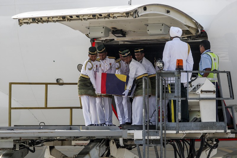 epa04363276 Royal Malay Regiment army personnel unloaded a coffin from a plane during the arrival ceremony of Malaysia Airlines MH17 victims, at the Kuala Lumpur International airport in Sepang, Malaysia, 22 August 2014. A special Malaysia Airlines flight from Amsterdam carrying the remains of 20 Malaysians aboard downed flight MH17 arrived in Kuala Lumpur as the country observed a day of mourning. The plane was met by relatives and senior officials at Kuala Lumpur International Airport where a ceremony was held to honor the victims. EPA/AZHAR RAHIM