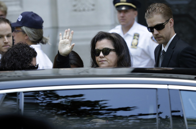 epa04389588 US comedian Rosie O’Donnell (C) waves to the crowd as she arrives for the funeral of US comedienne Joan Rivers at Temple Emanu-El in New York, New York, USA, 07 September 2014. Rivers died at the age of 81 on 04 September. EPA/PETER FOLEY
