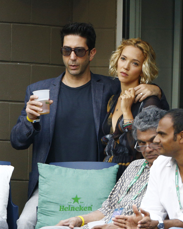 epa04391766 US actor David Schwimmer (L) and his wife Zoe Buckman (R) watch during the men’s final match between Kei Nishikori of Japan and Marin Cilic of Croatia on the fifteenth day of the 2014 US Open Tennis Championship at the USTA National Tennis Center in Flushing Meadows, New York, USA, 08 September 2014. The US Open runs through 08 September, a 15-day schedule. EPA/ANDREW GOMBERT