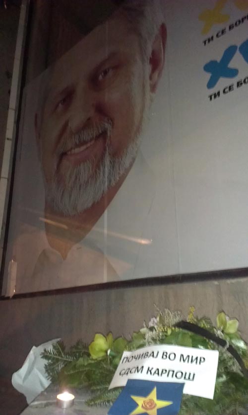 Цвеќе и порака „„Почивај во мир“, СДСМ Карпош“ осамна под плакат на кандидатот за градоначалник на Карпош Стевчо Јакимовски, денеска, на првиот ден од изборната кампања.