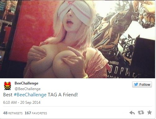 Станува збор за „BeeChallenge“, односно девојките се фотографираат така што ги симнуваат градниците и со нив ги покриваат очите.