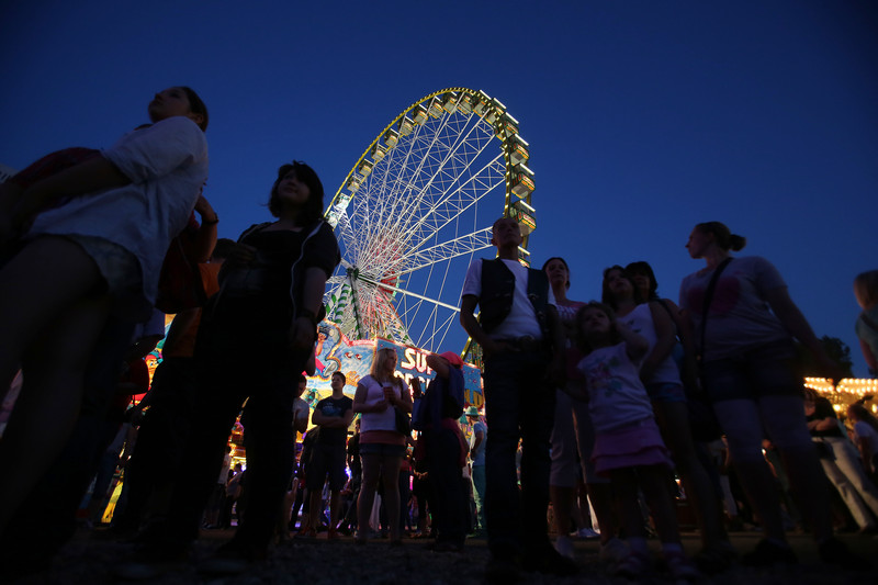 epa03812661 People crowd the Cranger Kirmes fair grounds in front of a ferris wheel in Herne, Germany, late 03 August 2013. The Cranger Kirmes is the second largest fair in Germany and only topped by the Munich Octoberfest. EPA/OLIVER BERG