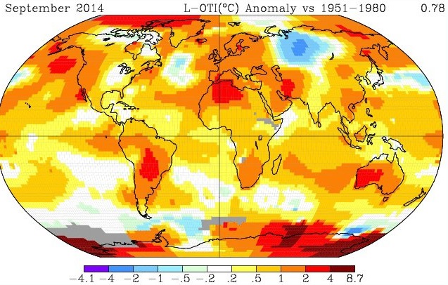 Според НАСА, септември бил најтопол досега. Овој податок продолжува да ги урива температурните рекорди оваа година. Досега, според евиденцијата, најтопли биле мај и август, но доколку продолжи вака, целата 2014 година би можела да биде најтопла откако се води евиденција за овие податоци.