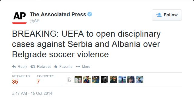 На профилот на светската новинска агенција „Асошиејтед прес“ (АП) на „Твитер“ осамна инфорамација дека Европската фудбалска федерација ќе поведе дисциплинска постапка за Србија и за Албанија во врска со синоќешните немили сцени на стадионот на Партизан во Белград во натпреварот од квалификациите за Европското првенство 2016 година меѓу овие две репрезентации.