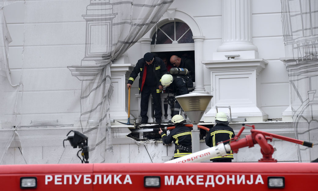 Пожарните екипи и полицијата се пред владината зграда. Воопшто не е забележан пламен, ниту пак во околината се чувствува миризба на чад.