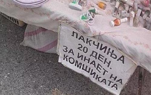Еден од многуте написи на продавачите по македонските тезги. Овојпат на еден скопски пазар може да си купите лак за нокти за само дваесет денари, благодарејќи на инаетот на продавачката.