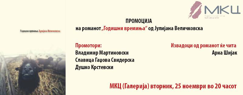 Издавачката куќа ПНВ публикации и Младинскиот културен центар организираат промоцијата на романот „Годишни времиња“ од Јулијана Величковска. За романот ќе зборуваат: Владимир Мартиновски, Славица Гаџова – Свидерска и Душко Крстевски, а извадоци од романот ќе чита Арна Шијак. Промоцијата ќе се одржи во Младинскиот културен центар (Галерија) на 25 ноември, вторник во 20 часот.