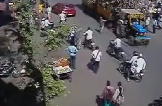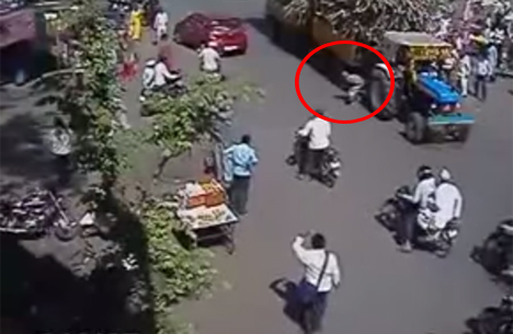 На неверојатно видео што се појави на интернет се гледа како натоварен трактор прегазува човек, но тој само си стана и си продолжи по патот како ништо да не се случило.