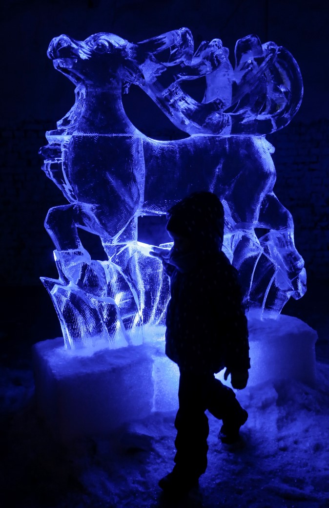 epa04527821 A young visitor walks pass an ice sculpture displayed at an exhibition organized as part of the preparations for the New Year celebrations in Kiev, Ukraine, 13 December 2014. EPA/SERGEY DOLZHENKO