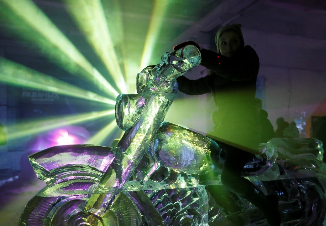 epa04527822 Visitors enjoy during an ice sculpture exhibition organized as part of preparations for the New Year celebrations in Kiev, Ukraine, 13 December 2014. EPA/SERGEY DOLZHENKO