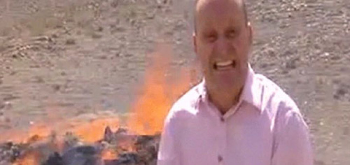 Новинарот развеселен се мачел да го заврши прилогот откако се издрогирал стоејќи премногу блиску до купот запалена дрога.