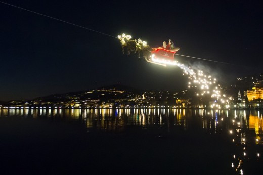 epa04538971 Santa Claus waves to the crowd from his flying sleigh drawn by reindeer over the Geneva Lake and in front of the Swiss and French alps at sunset during the 20th edition of the Christmas Market in Montreux, Switzerland, 23 December 2014. Santa Claus is ‘flying’ with the aid of a cable above the market and the lake on a distance of 385 meters. EPA/JEAN-CHRISTOPHE BOTT