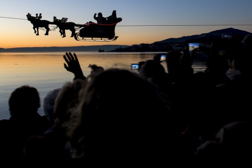 epa04538972 Santa Claus waves to the crowd from his flying sleigh drawn by reindeer over the Geneva Lake and in front of the Swiss and French alps at sunset during the 20th edition of the Christmas Market in Montreux, Switzerland, 23 December 2014. Santa Claus is ‘flying’ with the aid of a cable above the market and the lake on a distance of 385 meters. EPA/JEAN-CHRISTOPHE BOTT