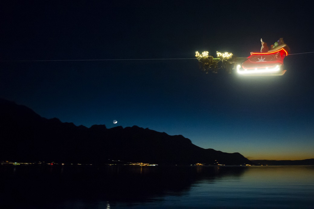 epa04538973 Santa Claus waves to the crowd from his flying sleigh drawn by reindeer over the Geneva Lake and in front of the Swiss and French alps at sunset during the 20th edition of the Christmas Market in Montreux, Switzerland, 23 December 2014. Santa Claus is ‘flying’ with the aid of a cable above the market and the lake on a distance of 385 meters. EPA/JEAN-CHRISTOPHE BOTT