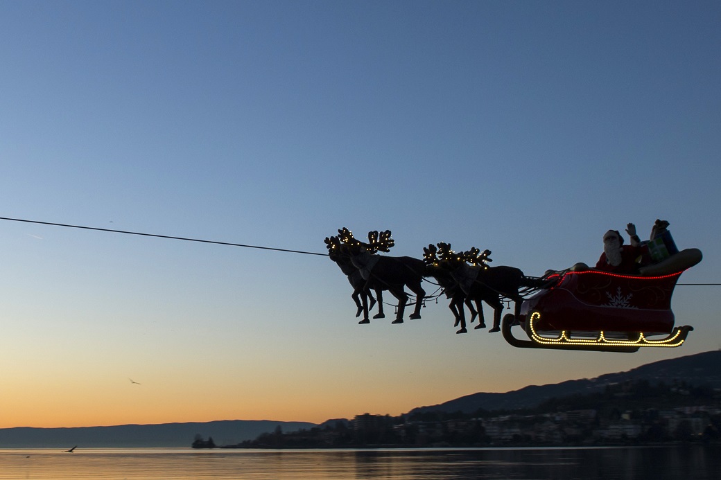 epa04538974 Santa Claus waves to the crowd from his flying sleigh drawn by reindeer over the Geneva Lake and in front of the Swiss and French alps at sunset during the 20th edition of the Christmas Market in Montreux, Switzerland, 23 December 2014. Santa Claus is ‘flying’ with the aid of a cable above the market and the lake on a distance of 385 meters. EPA/JEAN-CHRISTOPHE BOTT