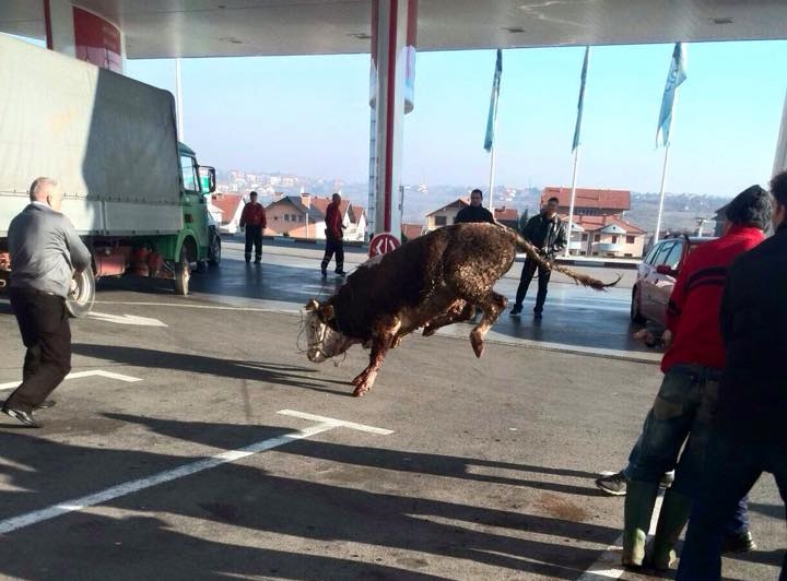 Разбеснет бик влегол во бензиската станица на „Лукоил“ во Куманово. Вознемиреното животно влегло и внатре во продавницата, каде ги бркал преплашените вработени и купувачите. Подоцна бил избркан надвор, каде продолжил со клоцањето и дивеењето.