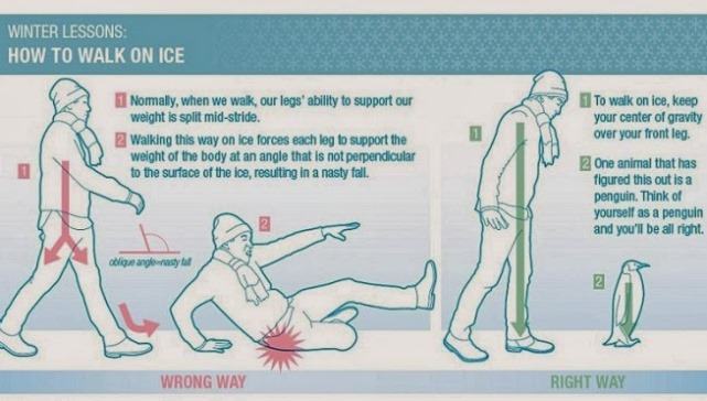 Целата тежина на телото треба да ја префрлите само на една, на предната нога – нешто што го прават пингвините и многу е мала веројатноста дека ќе паднете на мразот.