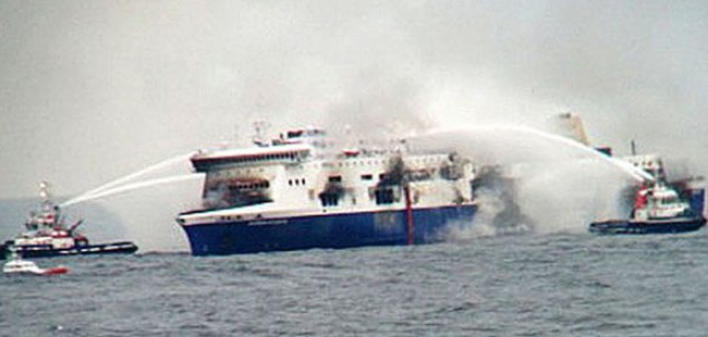 Бродот се запали додека пловеше северозападно од островот Крф, наспроти брегот на Албанија, но се уште не се знае што го предизвика запалувањето во делот каде биле возилата.