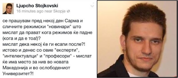 Оваа порака со закана преку социјалните мрежи е испратена од Љупчо Стојковски, демонстратор на професорот на правниот факултет Љубомир Д. Фрчковски. Се уште „не влезен“ на факултет со двете нозе, „аѓутантот“ на некогашната десната рака на Бранко Црвенковски и ударната сила на СДСМ, се заканува дека ќе брка од работа.