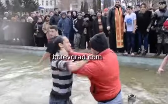 Илјадници православни верници во Бугарија го прославија празникот Водици на 6.јануари. Но во бугарскиот град Ботевград верниците го извадија крстот од водата со боксови.