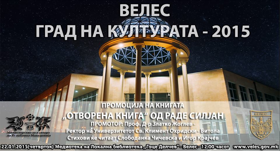 Во рамките на активностите „Велес град на културата“,утре ( на 22 јануари) во 12 часот во свечената сала на градската библиотека „Гоце Делчев“ ќе биде промовирана стихозбирката „Отворена книга“ од Раде Сијан, издание на „Матица македонска“ од Скопје.