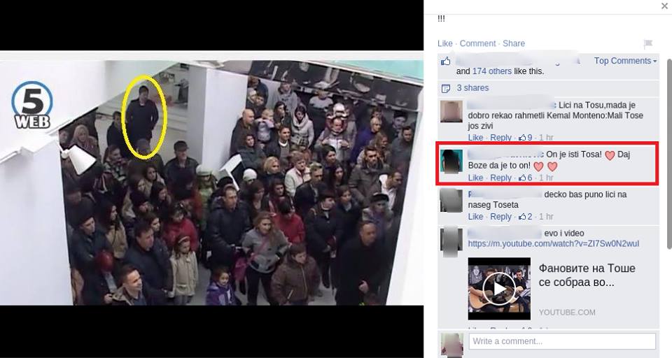Во ТВ прилогот за одбележувањето на денот на раѓањето на балканската ѕвезда Тоше Проески некои негови фанови го „видоа“ Тоше. Некои од нив веруваат дека позади толпата пријатели, роднини и фанови стои токму Тоше… „Дај боже да е тој“ – коментираат фановите…