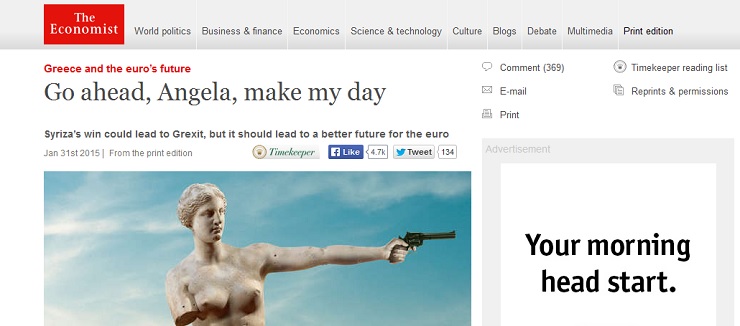 Во Грција пред пет години почна пеколната криза во еврозоната. Така, се вклопува дека во Грција сега треба да се случи расплетот, благодарение на големата победа на изборите на 25 јануари за екстремно левичарска популистичка партија СИРИЗА, предводена од Алексис Ципрас. Со барањето за големо намалување на долгот на Грција и ветувања за зголемување на јавното трошење, Ципрас „го фрли“ најголемиот предизвик досега за единствената валута во Европа, а со тоа и на Ангела Меркел, канцеларка на Германија, која ги воведе мериките на штедење на стариот континент, анализира Економист.