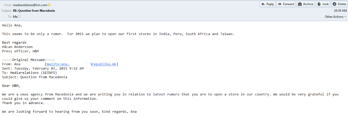 Македонија, сепак, не е на мапата на „ХиМ“ (H&M). Откако се појавија информации дека познатата марка ќе отвори свои продавници во земјава, „Република“ исконтактира со прес-службата на „ХиМ“. Оттаму велат дека се работи само за шпекулации.