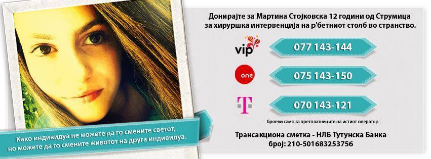 Семејството на дванаесетгодишната Мартина Стојковска од Струмица веќе со месеци се бори да ги собере потребните средства за нејзина операција. Мартина, слично како случајот на малечката Тамара Димовска од Велес, има пореметување на ‘рбетниот столб.