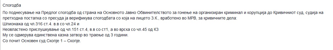 – По поднесување на Предлог спогодба од страна на Основното Јавно Обвинителството за гонење на организиран криминал и корупција до Кривичниот суд, судија на претходна постапка со пресуда ја верификува спогодбата со која на лицето З.К., вработено во МВР, за кривичните дела: Шпионажа од чл.316 ст.4. в.в со чл.24 и Неовластено прислушкување од чл.151 ст.4, в.в со ст1, а во врска со чл.45 од КЗ . Му се одмерува единствена казна затвор во траење од 3 години.- велат од Основен суд Скопје 1 – Скопје.