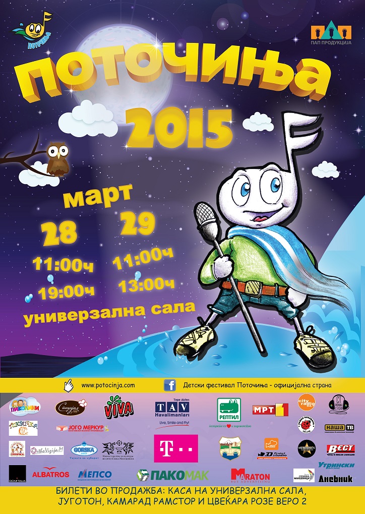 На 28 и на 29 март 2015 година нè очекува уште една прекрасна музичка приказна на сцената на Универзалната сала. По 12. пат ќе се одржи детскиот фестивал „Поточиња“. Со многу нови песнички и оваа година „Поточиња“ ќе ја најават пролетта. За забавата да биде комплетна, драмската секција на „Поточиња“ има подготвено прекрасни видеонајави за секоја песничка, а сите посетители ги очекуваат и многу изненадувања и награди.
