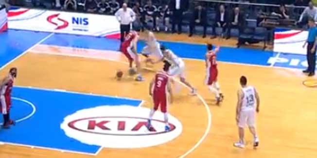 Мајсторски дриблинг низ нозе и атрактивен кош постигна кошаркарот на Партизан, Милосављевиќ во полуфиналното дерби од АБА-лигата против Црвена звезда.