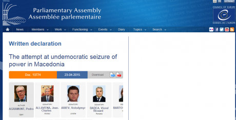 Денеска на официјалната веб-страна на Парламентарното Собрание на Советот на Европа објавена е писмена декларација за Осуда на недемократскиот начин на преземање на власта во Македонија. До денеска , а мозе декларацијата да се потпише и во текот на денот) истата е потпишана од 49 пратеници на Парламентарното Собрание на Советот на Европа од 21 земја и од 4 политички групи. Со ова декларацијата е потврдена, официјална и јавна и може да се користи за сите намери. Извори од Советот на Европа велат дека декларацијата ќе се потпишува и денеска и дека се очекуваат уште потписи на неа.