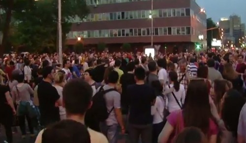 Дел од луѓето кои протестираат пред Собранието против наводна полициска бруталност со стаклени шишиња гаѓаат кон зградата на Собрание, тие носат маици или превези преку главите и на секој начин се обидуваат да предизвикаат судир со полициските службеници.