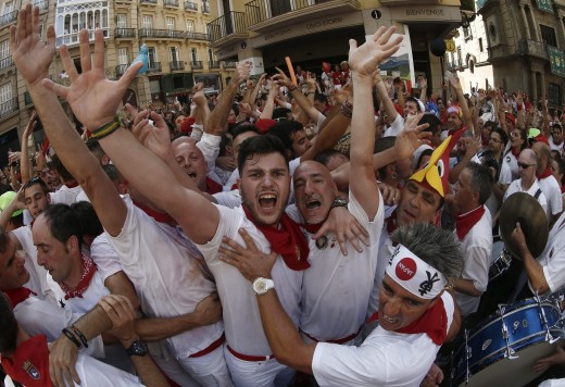 epa04834491 People take part in the traditional ‘Riau Riau’ song and dance during the Fiesta de San Fermin in Pamplona, Spain, 06 July 2015. The festival, locally known as Sanfermines, is held annually from 06 to 14 July in commemoration of the city’s patron saint. Hundreds of thousands of visitors from all over the world attend the fiesta. Many of them physically participating in the highlight event – the running of the bulls, or encierro – where they attempt to outrun the bulls along a 825 meter route through the narrow streets of the old city. EPA/JESUS DIGES