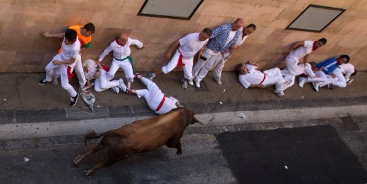 epa04834781 A fighting bull from the ranch of Jandilla stampedes during the Fiesta de San Fermin through the old city streets of Pamplona, Spain, 07 July 2015. The festival, locally known as Sanfermines, is held annually from 06 to 14 July in commemoration of the city’s patron saint. Hundreds of thousands of visitors from all over the world attend the fiesta. Many of them physically participating in the highlight event – the running of the bulls, or encierro – where they attempt to outrun the bulls along a 825 meter route through the narrow streets of the old city. EPA/JIM HOLLANDER