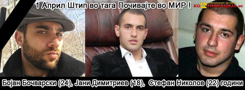 Дводневна жалост во Штип по смртта на трите момчиња што синоќа загинаа во сообраќајна несреќа. Животот го загубија Стефан Николов (22), Бојан Бочварски (25) и Јани Димитриев (18). На враќање од Скопје, каде што биле на свадба, излетале од пат. Загинаа на самото место.