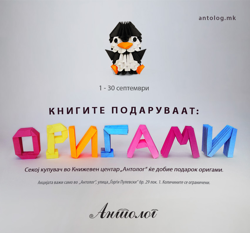 Издавачката куќа „Антолог“ од Скопје со големо задоволство ја најавува својата нова акција „Книгите подаруваат: оригами“. Имено, од 1 до 30 септември 2015 година, секој купувач во Книжевен центар „Антолог“ ќе добие подарок оригами изработено од Вера Велевска, која со тоа се занимава веќе неколку години и досега одржала повеќе работилници и изложби.