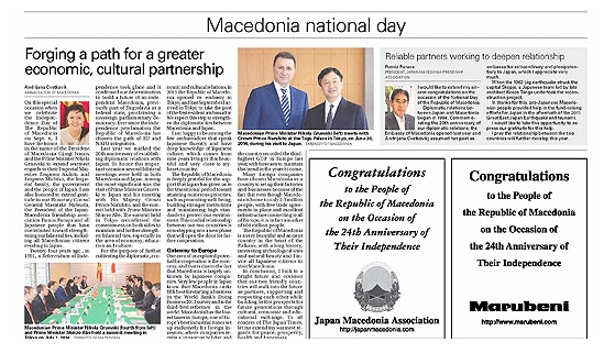 Како што соопшти Амбасада на Република Македонија во Јапонија, ова е прв пат овој весник да објави текст за Република Македонија, во позитивна светлина и во пресрет на нашиот голем национален празник.