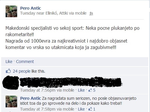 „Македонски специјалисти во секој спорт: Нека почне пликањето по ракометарите! Награда од 1.000 евра за најкреативниот и најдоброобјаснет коментар во врска со натпреварот што го загубивме“, напиша македонскиот кошаркарски див Перо Антиќ на „Фејсбук“ во вторникот, по натпреварот со Исланд.