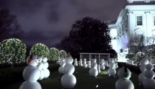 Во видеото кое што го објавија на својата официјална Фејсбук страна, можете да “прошетате” по ходниците на најпознатата куќа во САД, па можете да видите дека централната елка е накитена со боите на знамето на САД, додека Белата куќа ја “чуваат” снешковци.