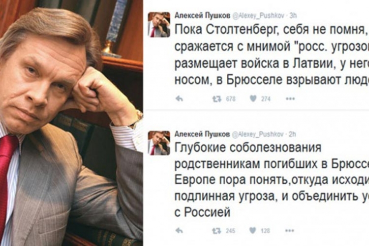 -Додека Столтенберг се бори против т.н. руска закана и инсталира војска во Летонија пред носот му ги креваат луѓето во воздух!, напиша Пушков. Тоа беше првата официјална реакција од Москва за терористичките напади во Брисел. Пушков подоцна изрази сочувство на семејствата на загинатите. „Европа треба да сфати од каде доаѓа вистинската закана и да ги зсдружи силите со Русија, напиша Пушков.