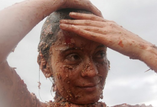 A woman smiles during the 5th Colombian ‘Tomatina’ festival held in the municipality of Sutamarchan, in the department of Boyaca, Colombia, 14 June 2009. During an hour children , youngsters and adults participated in the only Latin American ‘Tomatina’, a tribute to the red vegetable. EPA/CARLOS DURAN
