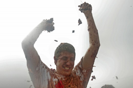 A man squeezes tomatoes during the 5th Colombian ‘Tomatina’ festival held in the municipality of Sutamarchan, in the department of Boyaca, Colombia, 14 June 2009. During an hour children , youngsters and adults participated in the only Latin American ‘Tomatina’, a tribute to the red vegetable. EPA/CARLOS DURAN