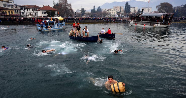 Бурето со вино и годинава беше причина многумина денес да влезат во водите на Охридското Езеро. Традиционално на денот на рибарите во Охридското езеро се капеа стотина млади охриѓани и ветераните. Тие се тркаа по бурињата со вино. Петар Рупески од Варош беше најсреќен, тој го фати наградното буре.den na ribarite 3