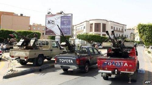 Неидентификувани вооружени лица, во триесетина возила, дел од нови вооружени и со противвоздушно оружје, ја опколија во неделата зградата на министерството, јави АФП.